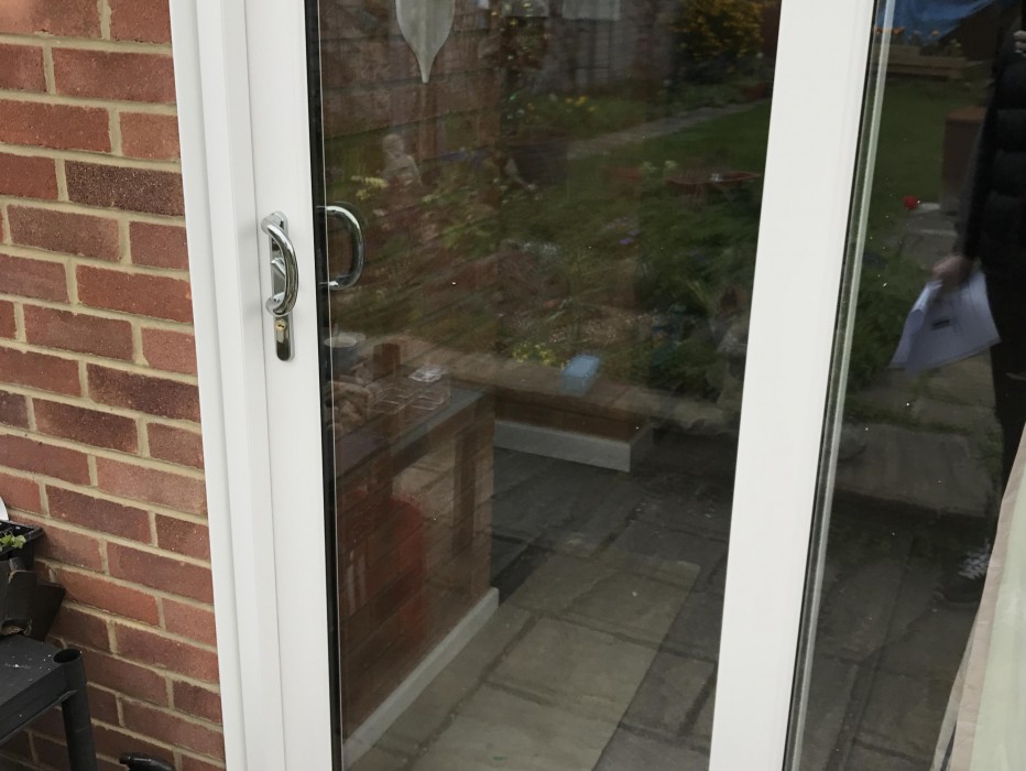 White UPVC A-rated double glazed patio door set, with black UPVC cill, installed in dartford.