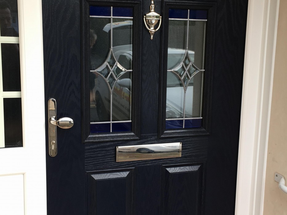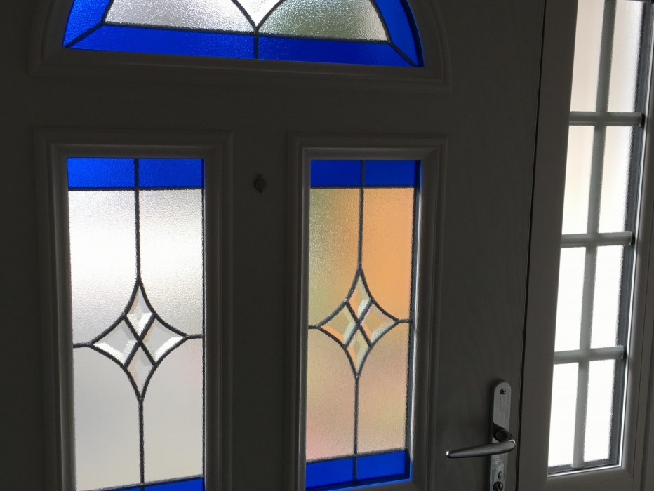 Installed in Sidcup, Magnum 8 Blue Composite door with side panel. Blue leaded feature Artwork.